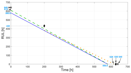 Figure 14 shows the evolution of the hammers RUL for the example. The solid line shows the real value at each time instant from the beginning of the life to the end, corresponding to the machine shutdown due to reaching the threshold. This curve is taken with the value reached in the real lifetime of the hammers used to obtain the model, corresponding to 580.8 h.