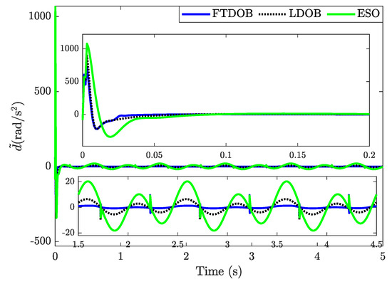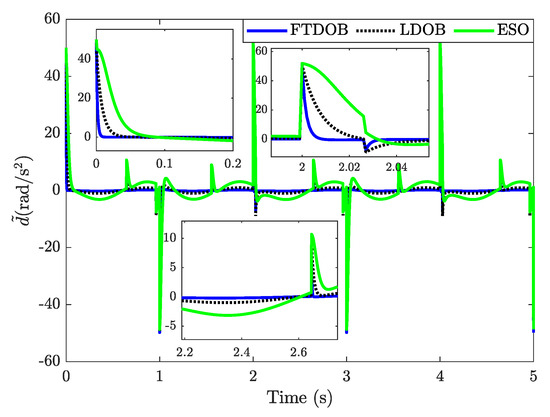 As shown in Figure 1, all observers were able to accurately estimate the lumped disturbance at a specific level. In addition, chattering-free estimations were achieved by the FTDOB, LDOB, and ESO. The estimation performance in terms of convergence rate and accuracy of the observers were explicitly presented in Figure 2. From zoom-in sub-figures of Figure 2, it can be observed that when the disturbance abruptly changes, the proposed observer exhibits a faster convergence speed and higher accuracy compared to the LDOB. Meanwhile, the ESO performed the worst estimation performance with a slower rate of convergence and lower estimation accuracy. The results indicate that the performance of the ESO significantly degrades when dealing with fast-changing disturbances.
