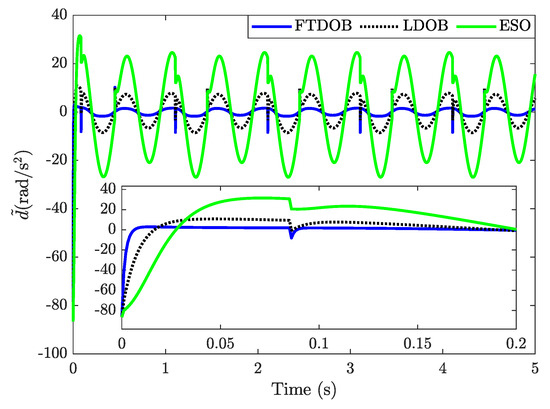 - FTDOB: The proposed DOB (30), with observer gains being chosen as and , and the tuning parameter selected as .