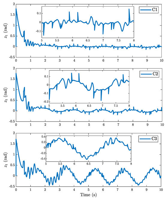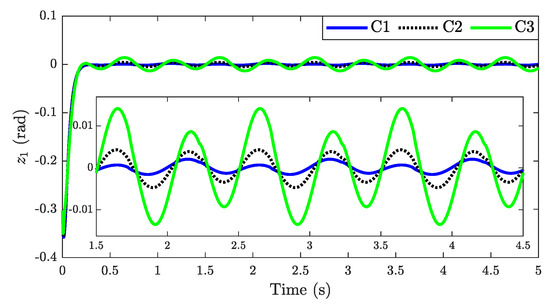 To evaluate the tracking performance of three developed controllers, a sinusoidal reference trajectory was utilized. The tracking errors of three comparative controllers are presented in Figure 8. As shown in this figure, the proposed controller C1 exhibits better tracking performance compared to the C2 and C3 controllers, with smaller tracking errors and less fluctuation around the equilibrium. Although the ESO-BC controller only requires system output information by virtue of the ESO in the estimation of both angular velocity and lumped disturbance, it displays the worst performance due to the insufficient estimation accuracy. Theoretically, the estimation performance of the ESO can be improved by increasing the observer bandwidth; however, excessive observer bandwidth causes the peaking phenomenon or even leads to instability.