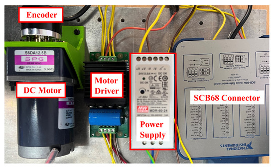 To confirm the feasibility and effectiveness of the recommended method, an actual DC motor system presented in Figure 6, was employed. A DC motor with a model, S6D15-24A, manufactured by SPG Co. Ltd., South Korea, which is powered by an MD-03 motor driver provided by Devantech Limited, England, was adopted. To measure the angular position and speed of the motor, an incremental encoder, E40H8-5000-3-V5, provided by Autonics company, South Korea, was utilized. In addition, an MDR-60-24 24VDC power source made by Meanwell company, Taiwan, was used to supply power to the overall motor system. Finally, an NI DAQ card, namely PCI 6229, from National Instruments company, was adopted to observe the angular position of the motor shaft from encoder signals and generate a control signal applied to the motor driver.