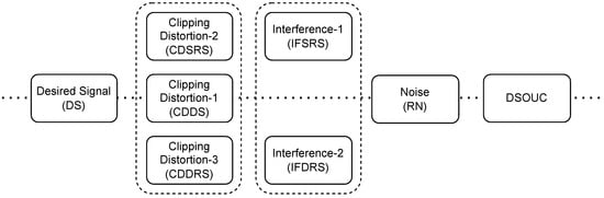 DS denoting the desired signal, and various sources of distortion and interference that can degrade the quality of this signal. CDDS represents the clipping distortion directly associated with the desired signal, arising when the signal’s amplitude exceeds a predefined threshold. IFSRS refers to interference caused by other UEs transmitting over the same RS as the UE of interest. Correspondingly, CDSRS symbolizes the clipping distortion emanating from these co-channel UEs. Furthermore, IFDRS describes interference from UEs that are allocated different RSs than the UE of interest. CDDRS captures the clipping distortion introduced by these cross-channel UEs. RN represents the received noise in the system, incorporating both external and internal noise sources affecting the signal reception. DSOUC stands for the desired signal as transmitted over an unknown channel, indicating the uncertainties and variations in the propagation environment that can affect the signal’s integrity. The notation is introduced to specify the clipping distortion noise observed in the frequency domain, attributed to the nth IoT devices within the gth group. The term specifies the initial uplink transmission power from a UE, while denotes the uplink power control factor applied to the nth IoT devices within the gth group to manage their transmission power effectively. This comprehensive framework highlights the multifaceted nature of signal quality assessment in communication systems, addressing both signal distortions and interferences alongside operational parameters like power control.