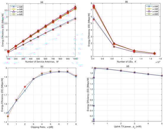 In Figure 2, we present the relationships between EE and several important parameters, M, K, , and . Simulation results are depicted as red ‘∗’ dotted lines. The theoretical analysis aligns well with the simulation results. Figure 2a illustrates EE versus M when . Assuming 3GPP-based systems, there are 168 available resource symbols in 1 ms, totaling 8400 available resource symbols in 50 ms [30,31,32,33,34,35]. Half of the available resource symbols are used for uplink RS at the maximum, resulting in with ms. Since when ms, in this case. We utilize W. As M increases, EE also increases. In the power consumption model presented in this paper, accounts for a larger portion than ; hence, with high , the EE performance is insufficient. There is little difference in EE performance between = 3 dB to 8 dB. Figure 2b displays the EE versus K when . With high K, both IUI and clipping distortion noise increase due to heavy RS reuse. In the denominator of EE, power consumption also rises as K increases. It is important to note that RS reuse commences at .