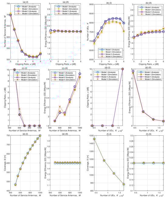 Determined parameters and corresponding EE based on the proposed scheme. In each subfigure, “I” represents the determined parameters and “II” indicates the corresponding EE. (a) Relation between M and , and corresponding EE, when , = 2 Mbps/W. (b) Relation between K and , and corresponding EE, when = 2 Mbps/W. (c) Relation between and M, and corresponding EE, when , = 2 Mbps/W. (d) Relation between and K, and corresponding EE, when , = 0.5 Mbps/W. (e) Relation between coverage and M, and corresponding EE, when , = 1.5 Mbps/W. (f) Relation between coverage and K, and corresponding EE, when , = 0.2 Mbps/W.