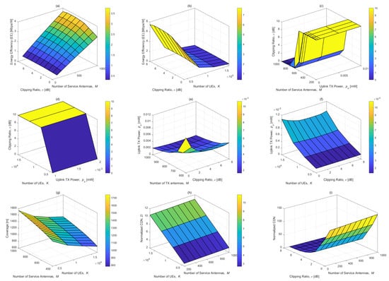 In Figure 4, we illustrate the variations in EE, , , , and the total clipping distortion noise (CDN) across specified parameters through a three-dimensional plot. This visualization provides a comprehensive overview of how these key metrics interact within the system’s parameter space. For the detailed analysis of total CDN, Figure 4g,h employ the following equation to quantify its variation with respect to other parameters, offering deeper insights into the impact of system configuration on clipping distortion noise: