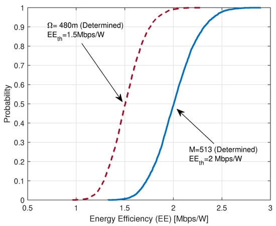 In Figure 5, we display the cumulative distribution function (CDF) of EE. The dotted line represents the scenario where we determined the allowable coverage using = 1.5 Mbps/W, , . We utilize (28) to obtain = 480 m. With the determined , the average EE is calculated to be 1.5 Mbps/W. On the other hand, the solid line corresponds to the case where we determined the value of M with = 2 Mbps/W, . Using (20), we obtain M = 513. With the determined value of M, the average EE is calculated to be 2 Mbps/W. It is important to note that represents the average EE of all IoT devices, with 50% of IoT devices having a higher EE than the threshold and 50% having a lower EE than the threshold. It is crucial to consider that in order to set the EE to prevent an outage, there must be sufficient EE margin. For instance, in the case of the dotted line, the EE threshold should be set below 1 Mbps/W to fully prevent the EE outage. Similarly, in the case of the solid line, the EE threshold should be set below 1.5 Mbps/W to fully prevent the EE outage.