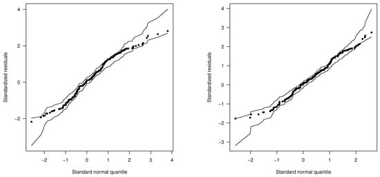 Plots of envelopes for using: (Left) BIZU and (Right) LNIZU models and periodontal data.