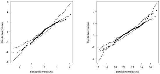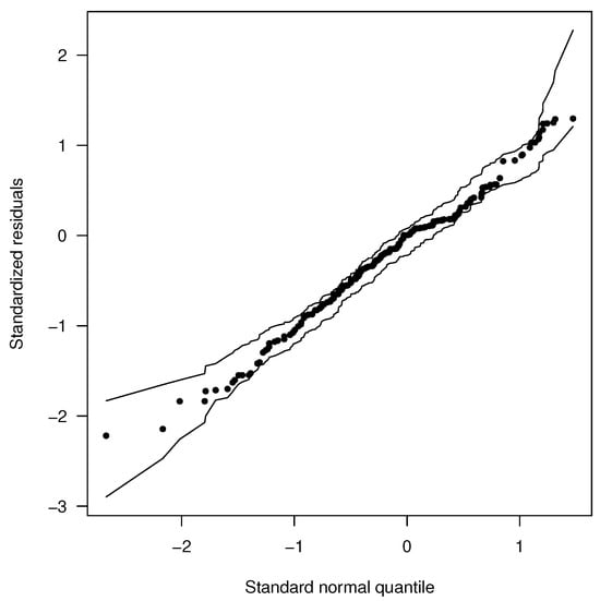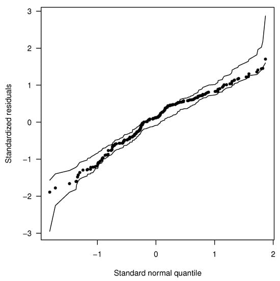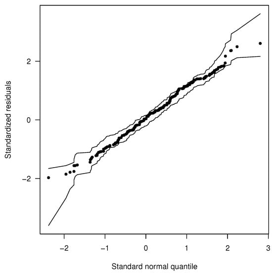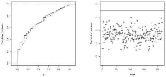 We also generated standardized residual plots to identify the presence of outliers when fitting the UPHNIZU model. Additionally, we present the cumulative distribution function (CDF) plot of the UPHN model (Figure 5). From these, the model shows a good fit, and no outliers are detected. In addition, envelope plots were obtained for the fitted models BIZU, LNIZU, and DCLPHN, which are presented in Figure 3 and Figure 4. These plots demonstrate that the BIZU and LNIZU models exhibit a better fit than the DCPHN model.