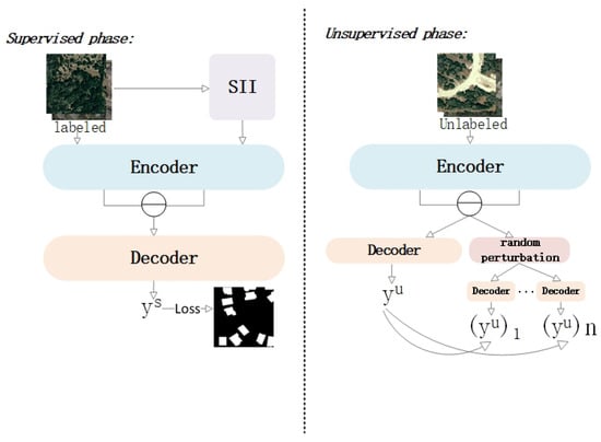 Semi-supervised learning is an effective strategy that combines labeled and unlabeled data to maximize the use of available information. In many applications, acquiring labeled data are often costly and time-consuming [23,24]. Therefore, semi-supervised learning provides a solution by leveraging information from unlabeled data. In semi-supervised learning, labeled data provide a clear mapping between input and output, allowing the model to optimize its predictive capability by learning from these samples. However, due to the scarcity of labeled data, the training of the model is often limited by the small sample size. At this point, the introduction of unlabeled data becomes crucial. Although these unlabeled samples lack explicit labels, they contain rich structural information and latent distribution characteristics that can help the model better understand the overall properties of the data. Consequently, semi-supervised learning has garnered wide attention in remote sensing image change detection tasks, as it effectively addresses the challenge of scarce labeled data in this field.