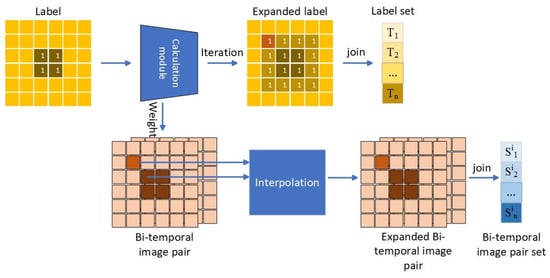 In this step, we utilize the pixels that have changed from 0 to 1 after the dilation operation in Section 3.2 and perform interpolation with the original changed pixels. We process the pre-change image and the post-change image separately to generate the new image pairs . The specific process is as follows: