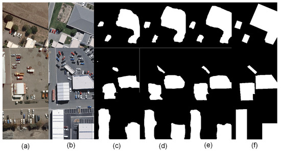 (a) image before the change, (b) image after the change, (c) RCR, (d) ECPS, (e) ours, (f) ground truth.