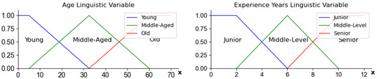 FFCA effectively handles quantitative data by fuzzifying each attribute into linguistic labels using membership functions that map values to a range of [0, 1] [20]. For instance, Table 1 shows the “age” and “experience years” linguistic variables. Figure 2 illustrates how these variables are converted to fuzzy contexts, as seen in Table 5, retaining the membership degree. For instance, in Figure 2, the age linguistic variable is defined by two trapezoidal membership functions for young and old linguistic labels and one triangular membership function for the middle-age (youth) linguistic label. Triangular membership function is defined using Equation (4).