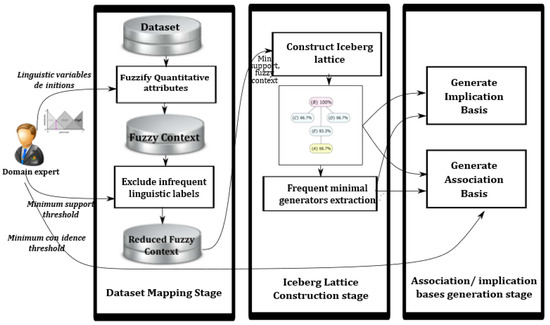 This section presents the proposed approach for extracting concise association rules from quantitative data. As depicted in Figure 4, the proposed approach consists of three stages, mapping quantitative attributes into a fuzzy representation, constructing a one-sided fuzzy iceberg lattice, and generating a condensed set of implication and association rules.