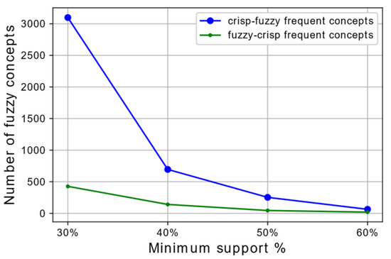 An iceberg lattice is a sub-concept lattice that highlights frequent closed itemsets (FCIs) above a support threshold, ignoring less frequent patterns. Therefore, it is regarded as the optimal method for extracting association rules due to its non-redundant and concise basis [24]. However, it still needs to be effectively applied to fuzzy-crisp FCA. Applying iceberg lattice to fuzzy FCA enables the effective handling of heterogeneous data (qualitative, quantitative, imprecise, and binary). While there is significant research on building binary iceberg lattices [24,25,26,27], only a few studies have utilized this approach for crisp-fuzzy FFCA, such as those of Mguiris et al. [16,22]. Crisp-fuzzy-based iceberg lattice suffers from the extraction of extensive frequent concepts, many of which are very similar in terms of the membership degrees of the concepts’ intents. On the other hand, the proposed approach utilizes a fuzzy-crisp-based iceberg lattice that merges similar fuzzy concepts and combines membership degrees within the fuzzy support. Therefore, the proposed approach aims to decrease the number of the generated fuzzy rules and enhance performance and optimization in visualizing crisp intents with fuzzy support.