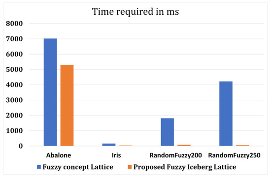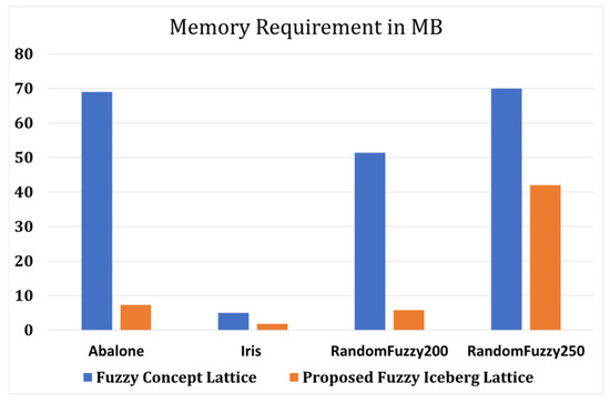 The work of Zou et al. in [11] represents a fuzzy-crisp FFCA approach for mining and updating ARs that incrementally builds the entire fuzzy concept lattice. Figure 7 shows the results of comparing the work in [11] with the proposed approach over synthetic fuzzy datasets, with a non-zero value percentage of 20%. The comparison result highlighted a significant reduction in the processing time achieved by the proposed approach. This reduction occurs due to the proposed fuzzy iceberg lattice rather than the entire fuzzy concept lattice. Additionally, Figure 8 and Figure 9 depict how much less time (in ) and memory consumption (in MB) it takes to make the fuzzy iceberg lattice than the entire fuzzy concept lattice over different types of datasets.
