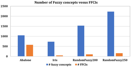 Figure 10 illustrates a comparison between the total number of fuzzy concepts in the full fuzzy concept lattice and the reduced number of concepts in the fuzzy iceberg lattice (FFCI) for various datasets—Abalone, Iris, RandomFuzzy200, and RandomFuzzy250. The fuzzy iceberg lattice, which includes only the strong fuzzy concepts meeting a specified minimum support, has a notable reduction in the extracted concept count. This reduction, quantified by the reduction ratio, ranges from 45.18% for Abalone to over 90% for the Iris and synthetic datasets (RandomFuzzy200 and RandomFuzzy250). These results highlight the efficiency of the fuzzy iceberg lattice in simplifying the concept structure, significantly lowering the computational and memory requirements while retaining essential information for the association rule mining.