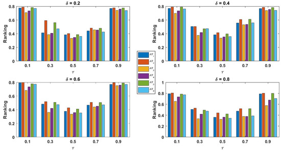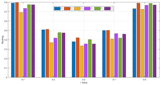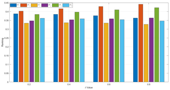 Once more, we arrive to the conclusion that is our superior choice and is our least favorable alternative. As evidence of our method’s resilience, our top choice has remained unchanged, and there has been little change to our overall rating. Because they prevent variance, these traits are very helpful to the the company’s methodology for making decisions. In order to focus on the role of both factors simultaneously regarding the ranking conclusions, we conducted an additional set of sensitivity checks; the numerical results obtained by varying both parameters simultaneously are presented in Table 20, where the highest-ranked alternative is highlighted. The corresponding outcomes are graphically depicted in Figure 7. This variation enabled the assessment of their influence on the ranking of alternatives, providing insights into the sensitivity and robustness of the rankings under concurrent changes in both parameter values.