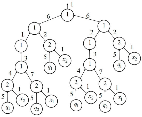 According to the graph of binary genetic programming, the number of levels required to encode the mathematical expression (18) should be at least . In the binary genetic programming graph, at the third level, the first and third functions with two arguments do not contain a second argument. Figure 2 shows the completion of the binary genetic programming graph with the second argument for functions with two arguments.
