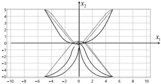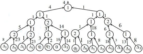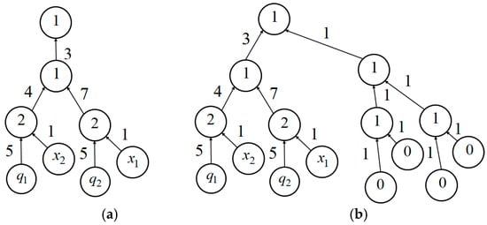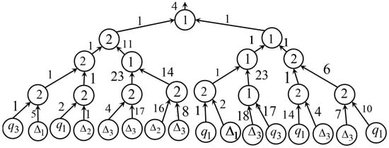 In Figure 4 and Figure 5, the numbers in the nodes, except for the leaves of the trees, represent the function numbers with two arguments: 1— and . Numbers near arcs are the function numbers with one argument: 1—, 2—, 3—, 4—, 5—, 6—, 7—, 8—, 10—, 11—, 12—, 13—, 14—, 15—, 16—, 17— 18—, 19—, and 23—. In the leaves, arguments of mathematical equations are presented, , , .