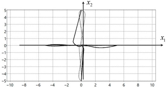 According to the above approach, the optimal control problem was solved 24 times, once for each initial state from the set of initial states (36). A direct approach was employed to solve the optimal control problem. The time axis was divided into equal intervals of . For each component of control, the parameter values were determined at the boundaries of the intervals, which were then connected by straight lines. As a result, a piecewise linear approximation of the control function was obtained. Considering the constraints on control, the control function had the following form: