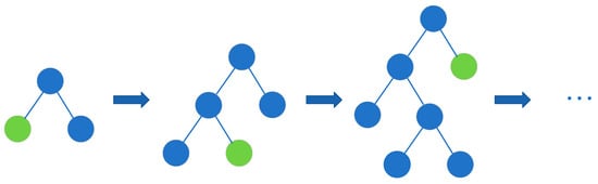Since the histogram algorithm does not need to consume additional storage resources to save the pre-sorted results, only the discretized values are required. Thus, LightGBM can effectively reduce memory usage. Additionally, because there is no need to traverse the original feature dataset during operations; instead, calculations are performed based on the constructed histogram just k times. This reduces the complexity of the calculation and improves computational efficiency. Building upon the histogram algorithm, a leaf-wise growth strategy, as illustrated in Figure 2, is adopted. Nodes with the largest splitting gain are preferentially selected for splitting, followed by selective treatment of leaf nodes within the same layer, which further reduces computational overhead.