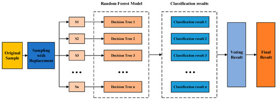 The random forest algorithm is an ensemble classifier developed from the regression decision tree proposed by Breiman, which uses the bootstrap method (Bootstrap) resampling technology to randomly select a certain number of samples from the original training sample set to generate a new training sample set. It then uses these self-service sample sets to construct multiple classification trees to form a random forest. For the new data sample, the random forest determines the reliability of the classification results based on the voting of the classification tree. Random forests essentially work by integrating multiple decision trees, each of which is built based on independently drawn samples [26]. The process of the random forest algorithm is shown in Figure 3.