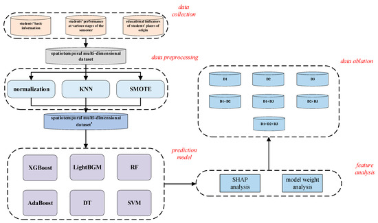 With rapid advancements in artificial intelligence and computer science, numerous advanced AI technologies have found broad application within engineering systems. Concurrently, machine learning has attracted considerable attention in Educational Data Mining (EDM) and has been utilized extensively for predicting students’ academic performance. A system employing multiple splits based on the Gini index and p-values was used by Noor et al. to build models combining six potential base machine learning algorithms arbitrarily [12]. Bansal et al. created an automated evaluation system for student performance using deep learning and machine learning techniques during the COVID-19 pandemic [13]. Asselman et al. suggested a PFA method utilizing different models like Random Forest, AdaBoost, and XGBoost to predict students’ academic performance [14]. The effectiveness of machine learning algorithms, including Naive Bayes, ID3, C4.5, and SVM, in forecasting students’ academic performance based on prior course performance was investigated by Pallathadka et al. [15]. Zhang et al. implemented a federated learning strategy, tailoring analytics to utilize distributed data while preserving privacy and decentralization [16]. To improve the accuracy of predicting students’ academic performance, machine learning algorithms have become an indispensable part of the EDM field and play an increasingly important role in educational evaluation. However, most current predictions of students’ academic performance lack consideration of multidimensional spatiotemporal factors. Firstly, in the learning of first-year courses, due to disparities in educational resources across different regions, students from different places of origin have varying levels of foundational grasp of the courses, thus experiencing different levels of difficulty in learning [17]. Secondly, most current research on predicting students’ academic performance does not track students’ performance over time, neglecting changes during the learning process. Unlike previous studies, in this research, a comprehensive multidimensional spatiotemporal feature framework was constructed to predict student performance. Innovatively, the combination of student basic information, learning performance at different stages within a semester, and educational indicators from the students’ origin regions was incorporated. This integration takes into account the dynamism of the student learning process as well as the potential impact of regional educational disparities on academic performance. Firstly, differences in educational resources across regions result in varying levels of foundational knowledge mastery among students upon enrollment, which subsequently affects their performance at various stages of university courses. By incorporating these spatiotemporal factors, researchers can delve deeper into the complex mechanisms influencing student performance, providing a more solid foundation for accurate prediction and effective intervention.