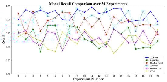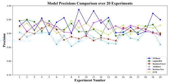 As shown in Figure 5, Figure 6, Figure 7 and Figure 8, each model showed excellent prediction results on three types of feature datasets, with XGBoost performing best on all four evaluation metrics (accuracy, recall, precisions, and F1 scores).