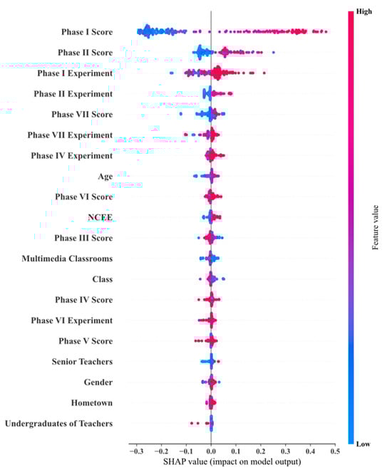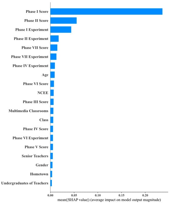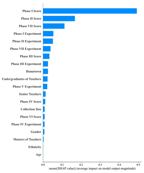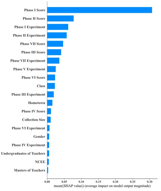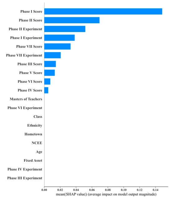 As shown in Figure 10, Figure 11, Figure 12, Figure 13, Figure 14, Figure 15 and Figure 16, this study used SHAP analysis to analyze the degree to which each attribute contributed to the prediction results. We found that students’ homework scores and experiment scores had the most significant impact on outcomes in Stages 1, 2, and 7. In this study, we analyzed the weights of each model to identify the features that had a significant impact on the prediction results. We selected the top five features for SHAP analysis, and the weights for each model are shown in Figure 17.