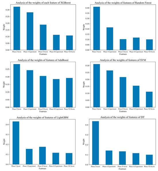This study identified the top five features that had the greatest impact on the prediction results through an analysis of the weights of various models. The top five features ranked by XGBoost weight values are as follows: Phase I Score = 0.323; Phase I Experiment = 0.281; Phase II Score = 0.189; Phase II Experiment = 0.113; Phase VII Score = 0.108. The top five features ranked by Random Forest weight values are: Phase I Score = 0.431; Phase I Experiment = 0.155; Phase II Score = 0.176; Phase II Experiment = 0.116; Phase VII Score = 0.113. The top five features ranked by LightGBM weight values are as follows: Phase I Score = 0.411; Phase I Experiment = 0.215; Phase II Score = 0.103; Phase II Experiment = 0.118; Phase VII Score = 0.101. The top five features ranked by LCE weight values are as follows: Phase I Score = 0.283; Phase I Experiment = 0.243; Phase II Score = 0.205; Phase II Experiment = 0.185; Phase VII Score = 0.192. The top five features ranked by Decision Tree weight values are as follows: Phase I Score = 0.437; Phase I Experiment = 0.142; Phase II Score = 0.134; Phase II Experiment = 0.116; Phase VII Score = 0.110. The top five features ranked by SVM weight values are as follows: Phase I Score = 0.311; Phase I Experiment = 0.265; Phase II Score = 0.217; Phase II Experiment = 0.155; Phase VII Score = 0.112.