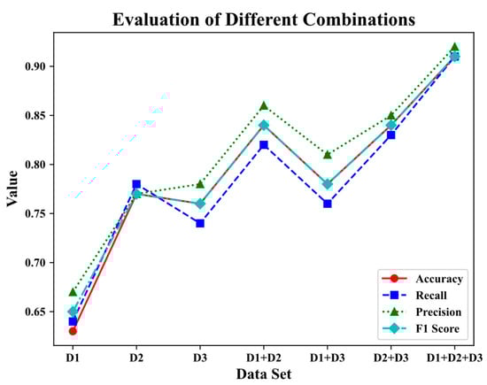 In this study, ablation experiments were performed on the dataset. In the data preparation stage of the study, we divided the dataset into three categories: student basic information data, student performance data at each stage, and student origin education indicator data, which we recorded as D1, D2, and D3. We divided and combined the data into six datasets: D1, D2, D3, D1 + D2, D2 + D3, D1 + D3, D1 + D2 + D3, and we used these six datasets to train the six machine learning models above, according to the 70% training set and 30% test set. Then, we evaluated the results with four evaluation indicators: accuracy, precision, recall, and F1 value, as shown in Table 5.