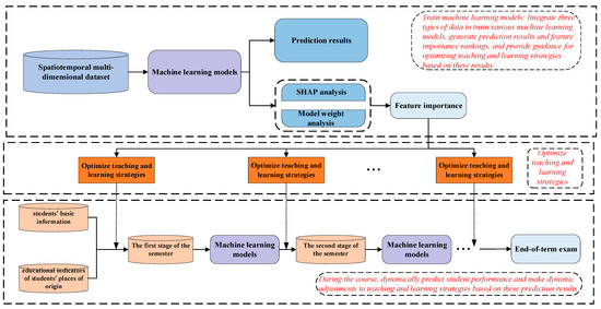 This study involved training machine learning models using historical data to predict the final grades of students. The experimental results demonstrated the effectiveness of the machine learning models when applied to spatiotemporal multi-dimensional feature datasets. Furthermore, through SHAP analysis and weight analysis, the importance ranking of each feature was derived, which holds significant guiding implications for educators in optimizing and adjusting teaching and learning strategies. Educators can allocate resources and attention reasonably based on the importance ranking of features. Adjustments to educational strategies primarily encompass two aspects: students’ learning behaviors and teachers’ intervention actions. Accordingly, this study proposed specific optimization strategies for both. Additionally, this research paid attention to the temporality of the course progression and the dynamic changes in students’ performance at different stages, dynamically adjusting teaching strategies in response to the outcomes of grade predictions at each stage. Moreover, in response to the disparities in educational resources and education quality among students’ places of origin, corresponding optimizations to teaching strategies were also made.