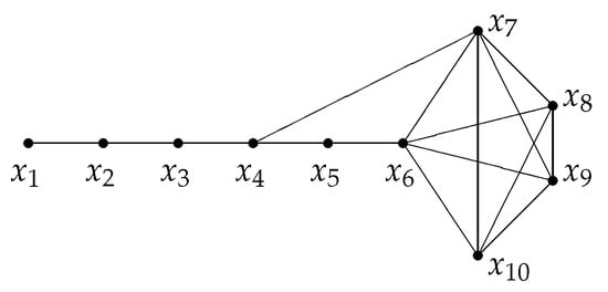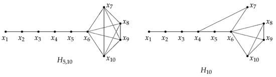 The graph H in Figure 3 has order 10 and . It is easily seen that . Since it is neither between and nor between and , by applying Theorem 3, we have . By Proposition 4, we can see that .