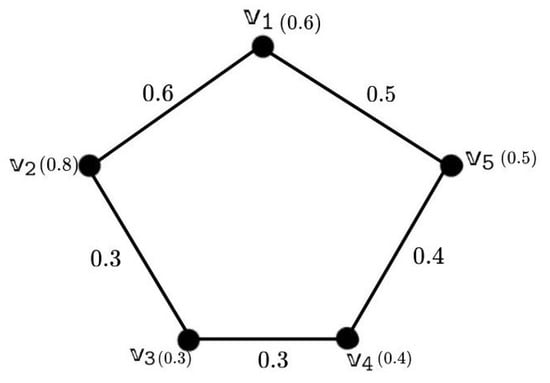 Consider a with vertices , where the membership values of the vertices are , , , , . The edges have the following membership values , , , , , , which are given below in Figure 1.