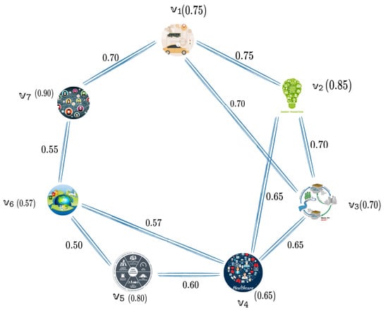 The membership values for the strong arcs between the systems in the smart city’s cybersecurity setup reflect how closely these systems need to work together. The arc between the transportation system and energy grid is given a high value of , as any problem in one system can directly affect the other. The connection between the transportation system and the communication network has a value of , showing a strong but slightly less critical collaboration. The water supply system and healthcare system have a value of , as both are important but their cooperation is not as urgent as other systems. The healthcare system and public safety system have a value of , indicating necessary but less intense cooperation. The arc between healthcare and waste management is set at , showing moderate cooperation, as waste management plays a role in public health but is not as critical. Finally, the arc between waste management and the communication network has the lowest value of , indicating a lower but still important connection. These values show the varying levels of cooperation needed for strong cybersecurity in the city’s infrastructure given in Figure 4.