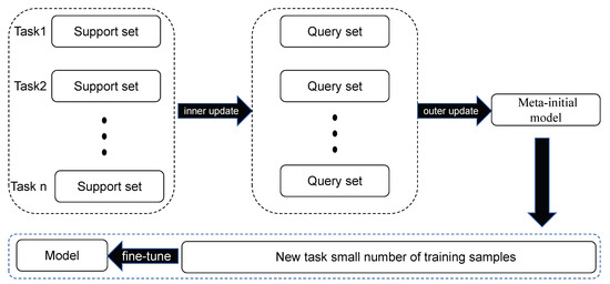 Meta-learning is about acquiring the ability to learn a mathematical model more efficiently and effectively rather than directly learning the prediction model. There are many meta-learning models proposed for deep learning, which can broadly be categorized as learning good initialization parameters [20,21], learning network structures, and learning optimizers [31,32]. Among these options, MAML stands out due to its ability to train models through gradient descents. Interestingly, MAML does not need to introduce additional parameters to the network model, so it can be applied to various learning problems. MAML acquires an effective starting weight that facilitates quick adjustment to novel tasks, resulting in swift convergence with limited training data and comprehensive fine-tuning, as shown in Figure 1.