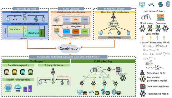 On the other hand, conventional federated learning usually assumes that data are independent and identically distributed (IID). Meanwhile, some existing studies have found that heterogeneous devices in real-world situations often make data non-independent and identically distributed (non-IID) in federated learning settings. Heterogeneous clients or data pose significant challenges to collaborative model training [19]. To improve the ability to adapt to individual client preferences, federated meta-learning, which integrates federated learning with meta-learning [20,21], is proposed in [22,23,24], enabling customized models for individual clients. However, there is still a risk of inadvertently disclosing client information [25]. Further research is required to ensure privacy protection in federated meta-learning. In addition, safeguarding data confidentiality is a legal, regulatory, and ethical need in various domains, including healthcare and finance. Therefore, federated meta-learning’s privacy and security preservation have significant theoretical and practical importance.