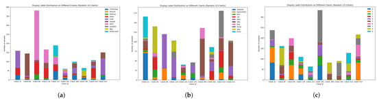Non-IID scenarios have two types. The first is the pathological non-IID scenario, and the second is the actual non-IID scenario. To simulate the realistic scenarios better, we assign these datasets to each client (default 500 clients) according to the Dirichlet to approximate the realistic scenarios closely. The Dirichlet [37] is used to simulate the non-IID setup among the federated clients. In this setting, the local data for each client are created according to the labeling ratios based on the Dirichlet distribution Dir from the sampling created from the original dataset. In this study, the same was used to divide the data into 500 clients, as shown in Figure 3.