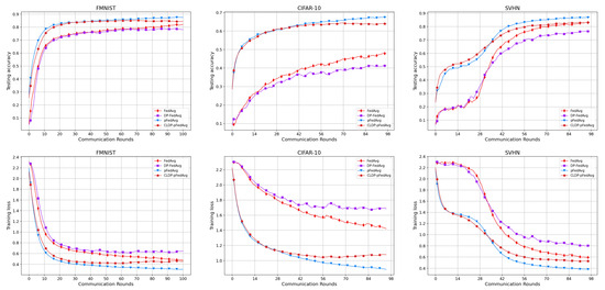 Second, regarding performance loss, there is a trade-off between the ability to maintain privacy and the model’s utility. Coupled with differential privacy, there is inevitably a specific performance loss at the cost. Therefore, in all experiments, DP-FedAvg has lower accuracy than FedAvg, and CLDP-pFedAvg has lower accuracy than pFedAvg. However, we find that the model performance of the scheme in this study still achieves FedAvg performance or even better than it even with performance loss, i.e., it achieves the best in CIFAR-10, which is higher. It is the worst in SVHN, but still not lower than FedAvg, but very close. And the accuracy loss of DP-FedAvg over FedAvg reaches and drops to . However, the highest accuracy loss of our scheme relative to personalized federated learning is only , which is lower than the lowest loss of DP-FedAvg, and the lowest accuracy loss is even only .
