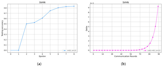 Third, in terms of privacy, since this scheme evaluates based on the provided r, , and noise multiplier z. Once exceeds a certain threshold, training stops immediately. When decreases, privacy protection requirements are higher. Therefore, it will lead to fewer rounds of communication rounds, leading to worse and worse model accuracy, as in Figure 5a. For , we also give the trend of with communication rounds, as shown in Figure 5b.