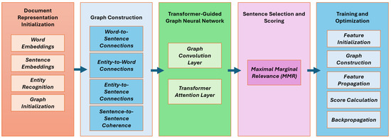 This section delineates the methodologies employed in the Knowledge-Enhanced Transformer Graph Summarization (KETGS) framework, designed to optimize extractive text summarization through advanced graph-based techniques and Transformer architectures. Initially, document representation is achieved by embedding words, sentences, and key entities, followed by the construction of a sophisticated graph that encapsulates the relationships among these components. Subsequently, the Transformer-Guided Graph Neural Network (TG-GNN) processes this graph to enhance node features dynamically, integrating local and global contextual information. The enhanced features are then utilized to score and select sentences based on their salience and relevance, culminating in the generation of concise and informative summaries. The overall process is structured to maintain a balance between computational efficiency and the accuracy of the summarization, ensuring the model’s applicability across diverse textual datasets. In Figure 1, the general structure of KETGS is presented.