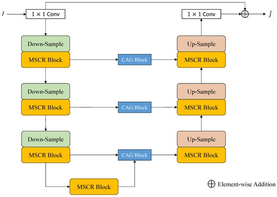 To achieve a better dehazing effect, we made some improvements to the traditional U-Net. We integrated MSCR blocks in both the upsampling and downsampling stages to extract multi-scale information from feature maps at each stage and enhance the processing capabilities of the encoder and decoder. In addition, MCADNet modified the skip connection strategy adopted in U-Net. The skip connection strategy of the traditional U-Net is to connect features after convolution to fuse the skip connection with the main path. These connections transfer low-level features directly from the encoder to the corresponding layer in the decoder, helping the network to retain the spatial information lost in the downsampling stage and play a role in preventing gradient disappearance. However, we believe that the simple skip connection mechanism in the traditional U-Net is not enough to reflect the relationship between the features in the decoder and the low-level features from the encoder well. Therefore, we replace the skip connection strategy of the traditional U-Net using CAG blocks to dynamically fuse feature maps from multiple paths. As shown in the experimental section, these design choices can significantly improve image quality.