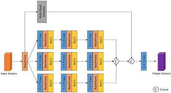 The batch-normalized feature map is processed by three parallel convolutional paths with kernel sizes of , , and , denoted as