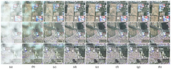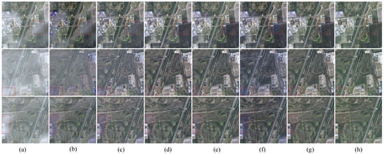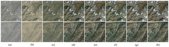 To objectively evaluate the performance of dehazing algorithms, reliable metrics are essential for quantifying the quality of the restored images. We selected the most widely used metrics, the peak signal-to-noise ratio (PSNR) and structural similarity index (SSIM) [], as evaluation metrics for remote sensing dehazing capabilities in this study. The two metrics provide complementary insights into the quality of the dehazed images, capturing both the overall fidelity and the perceptual similarity to the ground truth.