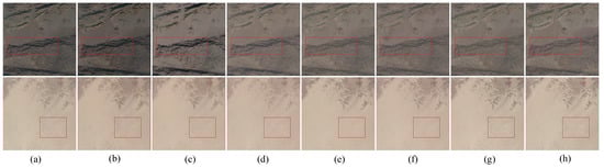 Figure 7 illustrates the dehazing results of all methods tested on the RICE1 dataset. It is evident from Figure 7a,b that AOD-Net and LD-Net fail to completely remove the haze from the images. Although AIDTransformer achieves a relatively good dehazing effect, closer inspection reveals persistent regional color deviation issues in the dehazed images. The dehazed outputs of FFA-Net, DehazeFormer, and our method are nearly indistinguishable from the ground truth.