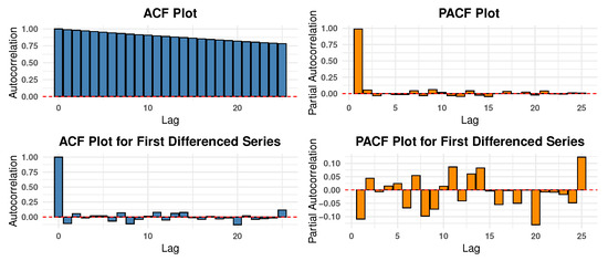 where in Equation (3), is the AR cofficient, is the MA cofficient, is an integrated term, and is a stochastic term [48,49].