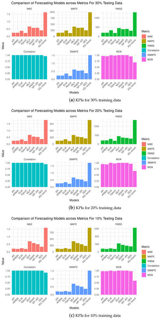 A commonly used empirical approach for comparing the effectiveness of two or more frameworks is the data-splitting technique. The BTC-USD data set is divided into two categories: the learning phase and the validation phase. The learning phase comprises three ratios. e.g., 70, 80, and 90%; the validation phase comprises 30, 20, and 10%. The results for the 70% training and 30% testing data set are presented in Table 3 [33]. The results presented in Table 3 show that the proposed hybrid model (9) outperforms other models in terms of the RMSE, MAPE, MAE, correlation, and SMAPE, with values of 184.2901, 136.0214, 0.2411, 0.9989, and 0.2313. In addition to this, the AR(1,0) model ranks 2nd in order of minimum errors and high correlation, while the 3rd model which results in minimum errors and high correlation is the ARIMA (1,1,1) model. A graphical demonstration of these metrices is provided in Figure 3a for the error metrics. Similarly, the results for 80% training and 20% testing are given in Table 4, which indicates that the proposed hybrid model results in slight improvements in the error metrics with RMSE = 182.7972, MAE = 134.7952, MAPE = 0.2241, and SMAPE = 0.2293. In contrast, fairly high correlation values between the observed and fitted values are given by the ELM, MLP, and NP-AR models. A graphical display for these metrics is given in Figure 3b. Lastly, for the 90% learning phase and 10% testing phase, the proposed model surpasses other comparative models and shows improved significant results in terms of errors, such as RMSE = 147.6284, MAE = 112.0043, and MPAE = 0.1882, which are presented in Table 5. However, for the correlation and MDA, the ELM, MLP, and NNAR (1,1) models produce better results than the hybrid model. A graphical demonstration of these KPIs is given in Figure 3c.