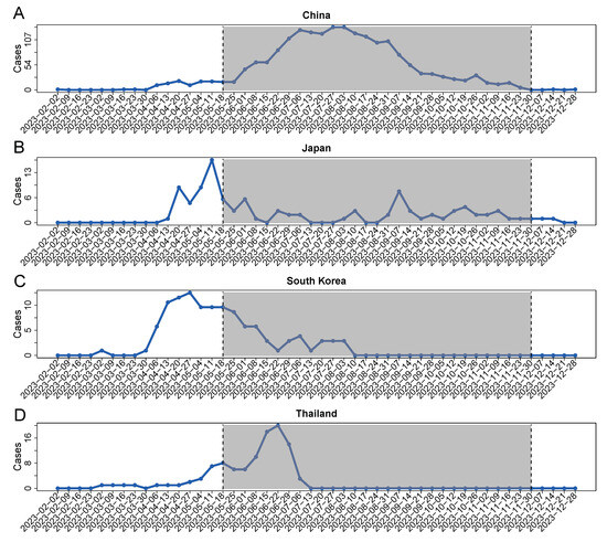 Despite the WHO efforts, the outbreak persisted, albeit at reduced levels, prompting the WHO to declare an end to the PHEIC in May 2023 [1]. Pockets of transmission, however, continued, with a total of 92,226 confirmed cases and 185 deaths reported across 117 countries as of 4 May 2023 [5]. Throughout 2022, Asia experienced the fewest cases across all regions, with only approximately 20 cases across all countries in the region [6]. Nevertheless, the transmission dynamics of the outbreak have also quickly evolved, with confirmed cases emerging later in countries across Asia, including South Korea, China, Japan, and Thailand among the primarily impacted countries in 2023. The outbreak appeared at different times in each country. The first case was in South Korea on 22 June 2022 [7]. The next index case was in Thailand on 21 July 2022 [8]. Several days later, on 25 July 2022, Japan registered the first mpox case [9]. Finally, China registered its index case on 16 September 2022 [10]. This new geographic expansion into Southeast Asia indicates the ongoing nature of the outbreak and highlights the need for comprehensive global surveillance and response mechanisms, even in previously non-endemic regions.