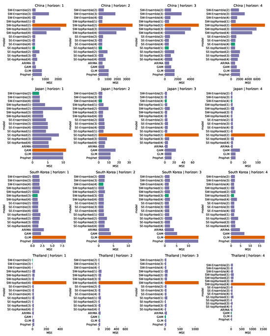 MSE of predictions across China, Japan, South Korea, and Thailand and four prediction horizons (1, 2, 3, and 4 weeks forward). Teal bars are the best metric for the particular combination of location and horizon, and dark orange bars are the models with the worst metrics. SW stands for Sub-epidemic Wave and SE for n-Sub-epidemic frameworks. Ranked models are singular models used for the ensembles.
