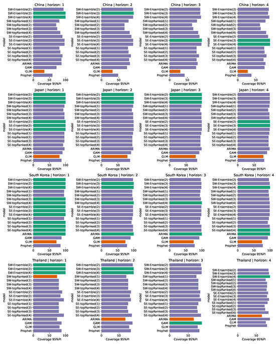 Coverage 95% Prediction Interval metrics across China, Japan, South Korea, and Thailand and four prediction horizons (1, 2, 3, and 4 weeks forward). Teal bars are the best metric for the particular combination of location and horizon, and dark orange bars are the models with the worst metric. SW stands for Sub-epidemic Wave and SE for n-Sub-epidemic frameworks. Ranked models are singular models used for the ensembles.